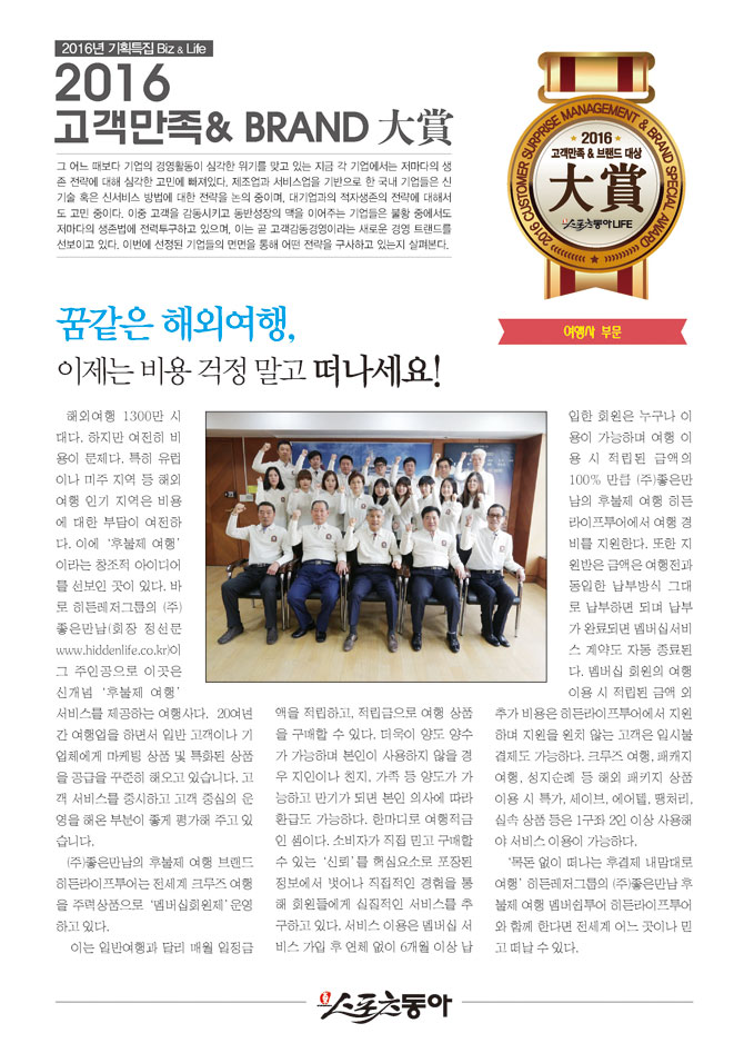 저희 “㈜히든라이프” (히든투어)는 여러 시상식에서 대상을 받아 브랜드 파워 및 영양있는 기업으로 인정받고 있습니다.