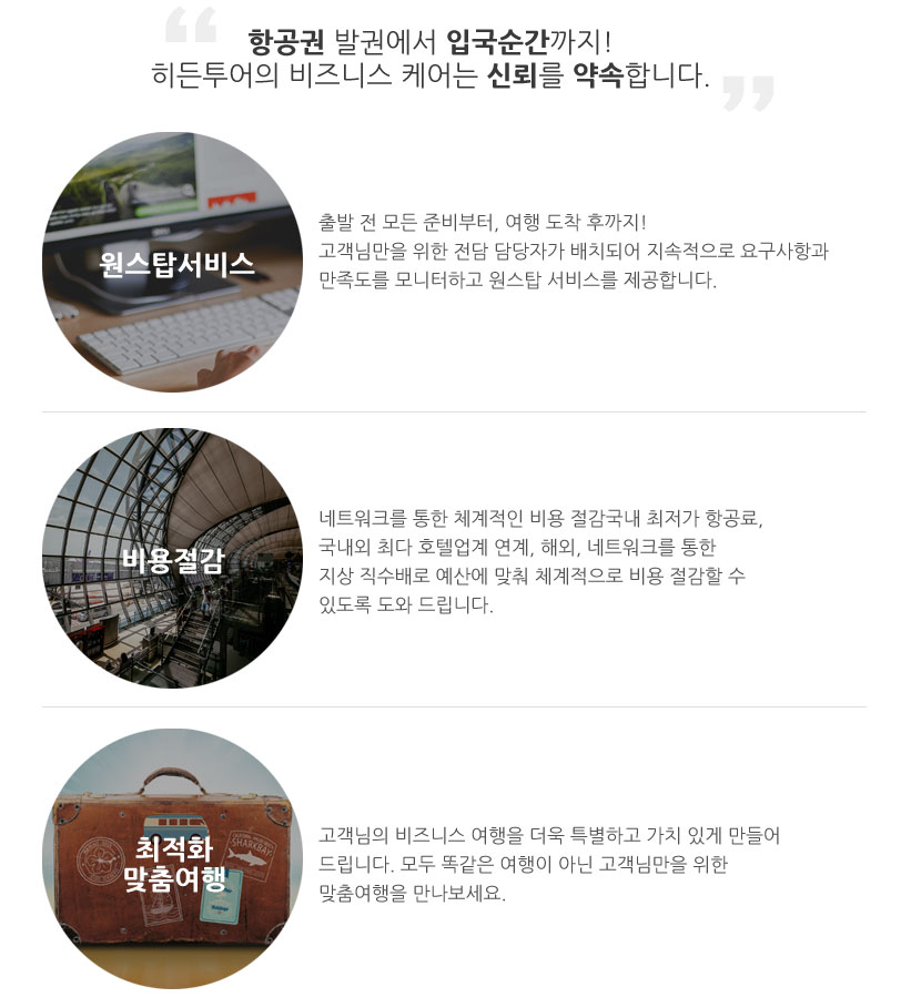Business Travel 및 M.I.C.E 행사 단체여행도 히든투어만의 전문화 된 서비스를 경험해보세요. 20여년간의 노하우로 잘 다져진 국내외 네트워크를 활용하여 고객의 최적화된 One Stop 서비스를 제공합니다.